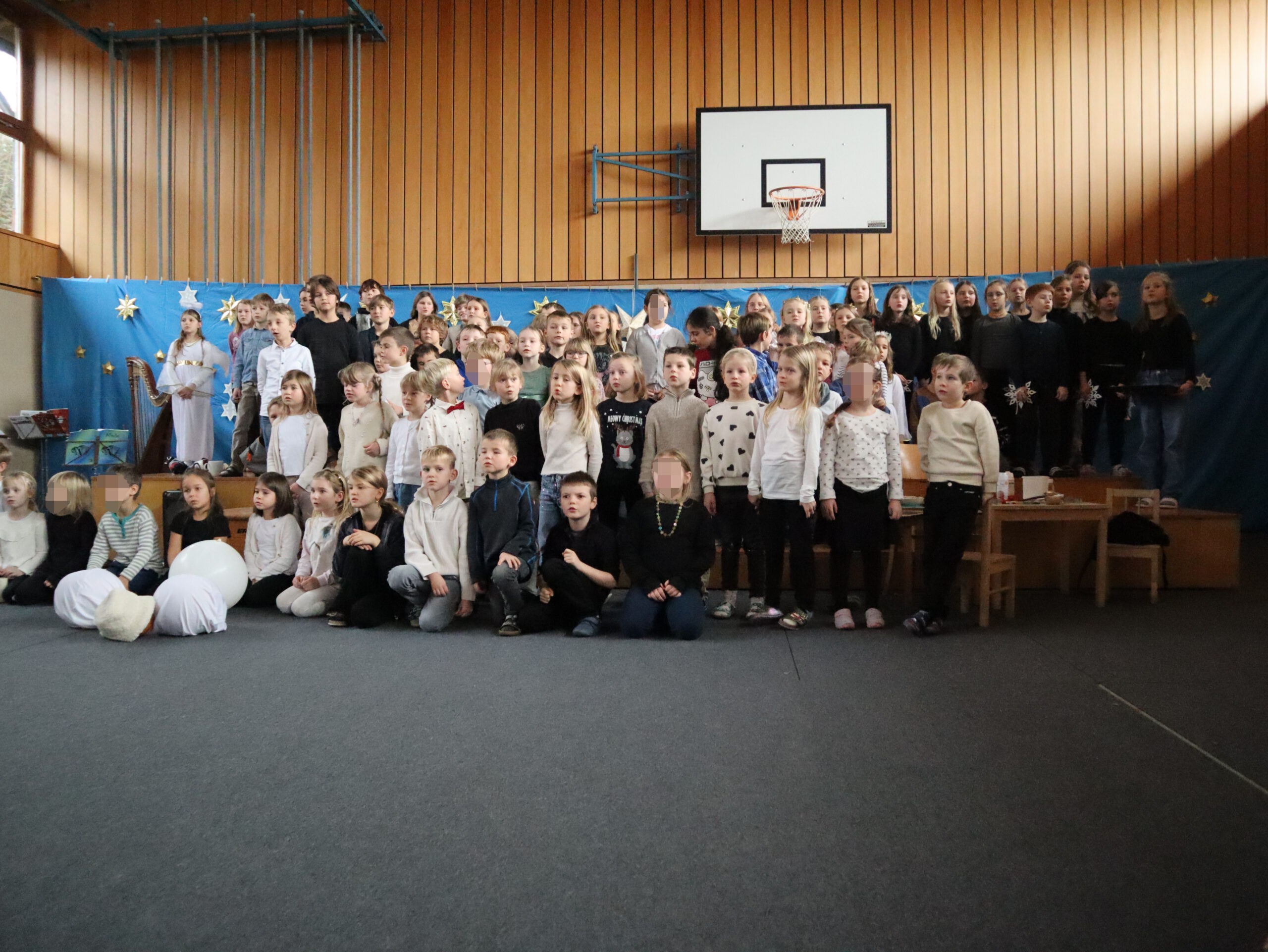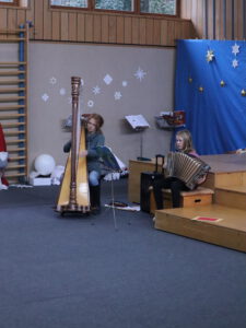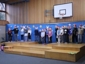 Was sich wohl hinter den Türchen des Adventskalenders versteckt? Diese Frage stellen sich große wie kleine Leute jedes Jahr im Dezember wieder voller Spannung. In der Pauluszeller Weihnachtsfeier wurden nun symbolisch 15 Türchen geöffnet und hinter jedem verbarg sich der Auftritt einer Klasse oder Gruppe. Vom Adventsspiel der 2. Klasse über die Klöpfelaktion bis zum „Hexenschuss“ des Weihnachtsmannes, von den Flötenkindern über den Schneemanntanz der 1. Klasse bis zum Instrumentalstück mit Diatonischer und Harfe, vom englischen Lied der 4. Klasse bis hin zum Luciaspiel der Drittklassler wurden den Zuschauern in der voll besetzten Turnhalle viele schöne Programmpunkte geboten. Mit K. H. Waggerls Krippenspiel „Wie Ochs und Esel zum Stall in Bethlehem kamen“ brachten die Viertklasskinder mit tollen Kostümen und vollem Einsatz das Publikum zum Lachen und die szenische Darstellung der 3. Klasse zum Popsong „Merry Christmas everyyone“ fasste die Freuden der Vorweihnachtszeit abschließend zusammen.