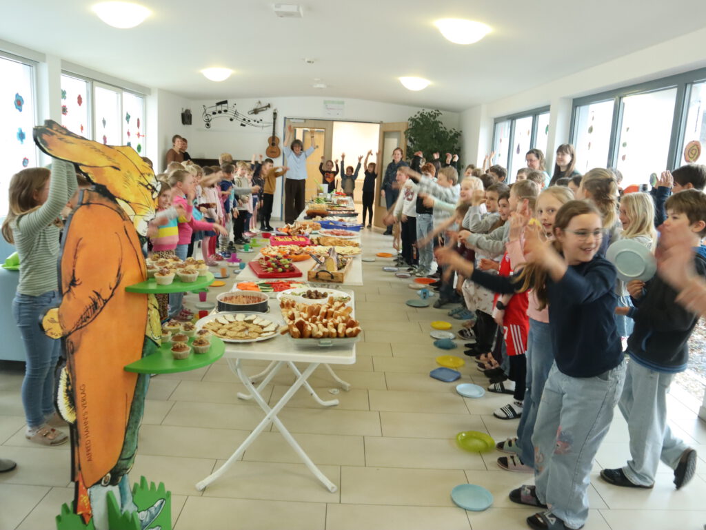 Am vergangenen Freitag übernahmen die Eltern der 3. Klasse die Organisation des 2. Lesefrühstücks. Gesunde, leckere Snacks, österliche Köstlichkeiten, eine Müsli-Bar und Getränke standen für die Kinder zur Pause bereit. Mit „Lesearbeit“ hatten sich die Schülerinnen und Schüler ihr besonderes Frühstück verdient: Die 1. Klasse hatte Lesemamas zu Besuch und die Kinder übten das Lesen intensiv in Kleingruppen, bevor sie dann einer Geschichte zuhören durften. Die 2. Klasse befasste sich mit dem Frühlingsgedicht „Die Tulpe“, die 3. Klasse löste mit einem Kaufhausdetektiv eine Kriminalgeschichte und die 4. Klasse sammelte Punkte mit der Bearbeitung von Texten im Antolinprogramm.