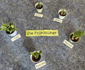 Im Fach HSU beschäftigt sich die 1. Klasse passend zur Jahreszeit mit dem Thema Frühblüher. Im Sitzkreis wurden die kleinen Pflänzchen genau betrachtet, beschrieben und gemeinsam benannt. Viele Kinder entdeckten dabei Bekanntes wieder: Einige Frühblüher haben sie bereits im eigenen Garten oder bei Spaziergängen mit ihrer Familie gesehen.