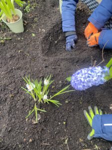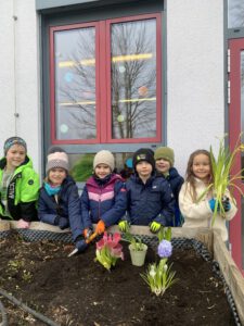 Zum Abschluss wurden die Frühblüher in das Hochbeet vor dem Klassenzimmer eingepflanzt. Dort können nun alle Kinder der Schule beobachten, wie sie weiter wachsen und den Frühling willkommen heißen.